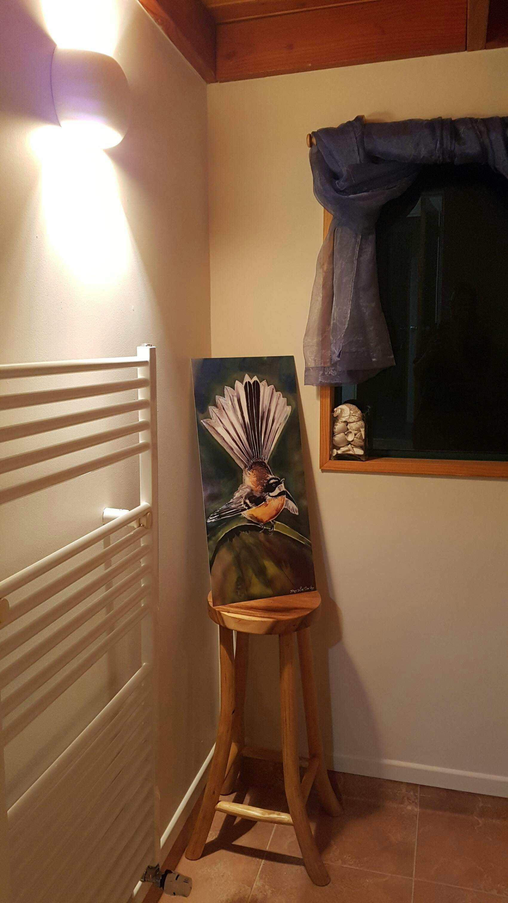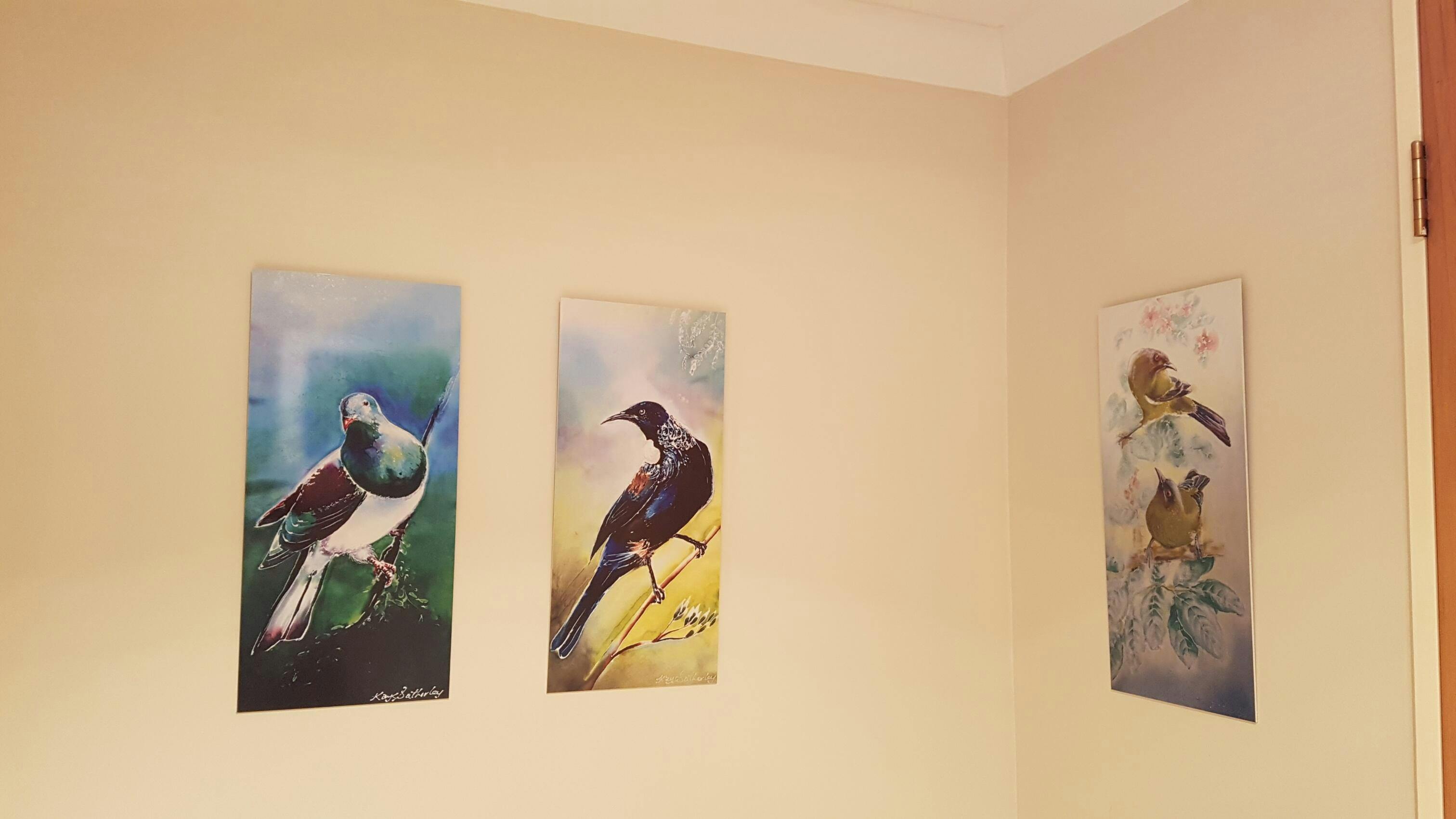 I bought another set of 3 bird panels for my guest bathroom. All Kay's birds are striking and brighten up any space. I use them as a focal point in both bathrooms and am loving the blue-green colour combo. We have a real fantails and tuis out in the garden so this is my way of bringing the nature in the house. w